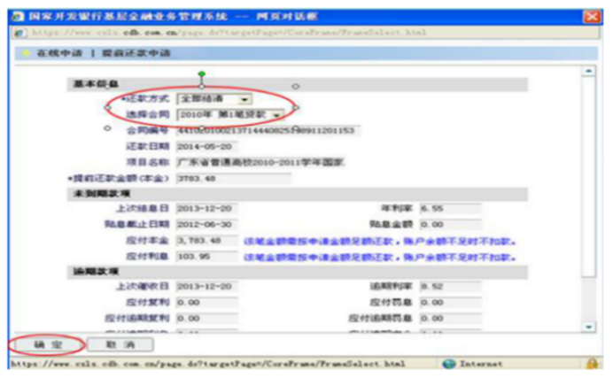 高校贷款选择【还款方式】——【选择合同】后点击【确定】;生源地贷款先勾选左边需要进行还款的合同(全部结清的点击全部结清,部分还款的输入还款金额),再点击右边【提交申请】,每月只能提出一次提前还款。
