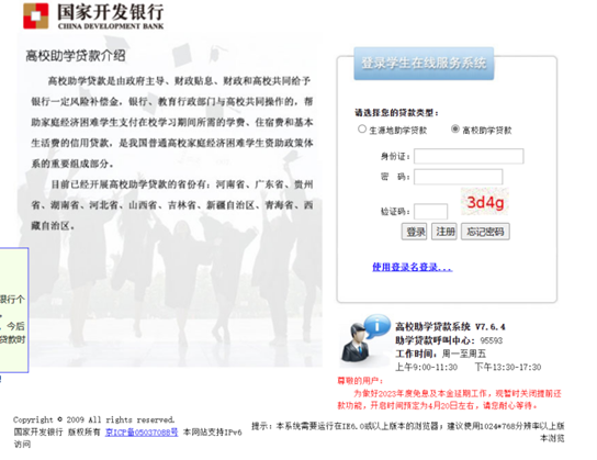 登录国家开发银行学生在线服务(https://www.csls.cdb.com.cn/),打开学生在线服务系统(选择 高校/生源地)界面,并登陆贷款系统,(登陆用户名为个人身份证号,登录初始密码为各学院录入借款学生信息时系统自动生成的初始密码)。