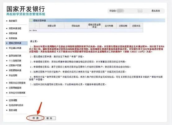 通过个人首页,高校贷款点击左侧【提前还款申请】进入还款申请,申请金额必须为人民币500元以上、且为100元的整数倍数的金额。