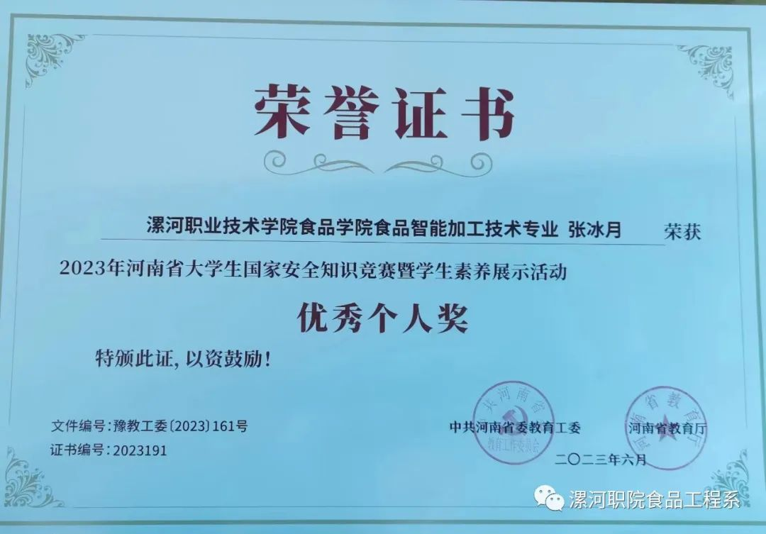 恭喜!食品工程系张冰月在2023年河南省大学生国家安全知识竞赛暨学生素养展示活动中荣获优秀个人奖