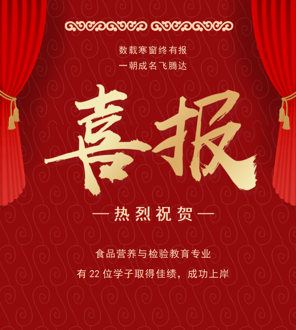截至目前,食品营养与检验教育专业2023届毕业生共有22位优秀学子在考研的战场上取得佳绩,成功上岸。其中,有五位同学分别被985、211、双一流高校录取。行远自弥,他们风雨兼程;前路璀璨,他们未来可期。食品学院学子以实干笃定前行,用汗水浇灌出梦想之花。真正有价值的事情,都不是轻轻松松能完成的。清醒的克制,暗暗许下的承诺和辛勤的汗水共同绘就了这似锦的前程画卷。