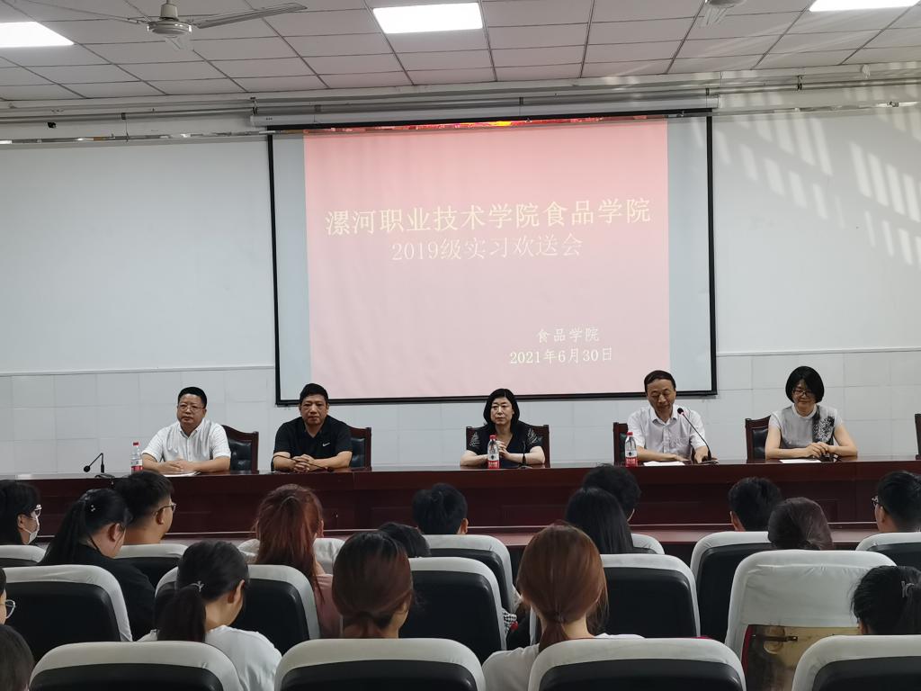 2021年6月30日,食品学院召开2019级顶岗实习学生欢送会,学校副校长程传蕊、招生就业处处长王树杰、食品学院书记贾新政、院长崔惠玲、副书记王文甫、带队老师郭志芳、赵美琳和2019级95名学生参加会议,会议由院长崔惠玲主持。