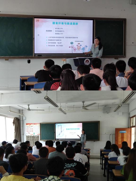 值2021年全民营养周5.20中国学生营养日主题宣传活动之际,休闲食品协同创新中心邀请漯河中心医院营养科大夫马纪飞5月21日走进太阳集团tyc4633食品学院,为学生开展了题为“膳食纤维与慢性病”的营养科普讲座。
