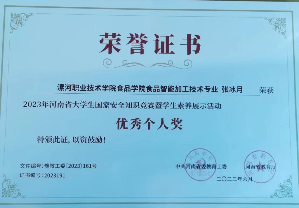 为深入贯彻落实总体国家安全观,不断增强国家安全意识和素养,牢固树立以人为本,安全责任重于泰山的观念,食品工程系积极组织学生参加2023年河南省大学生国家安全知识竞赛暨学生素养展示活动,其中,食品智能加工技术专业张冰月同学在此次活动中荣获优秀个人奖。