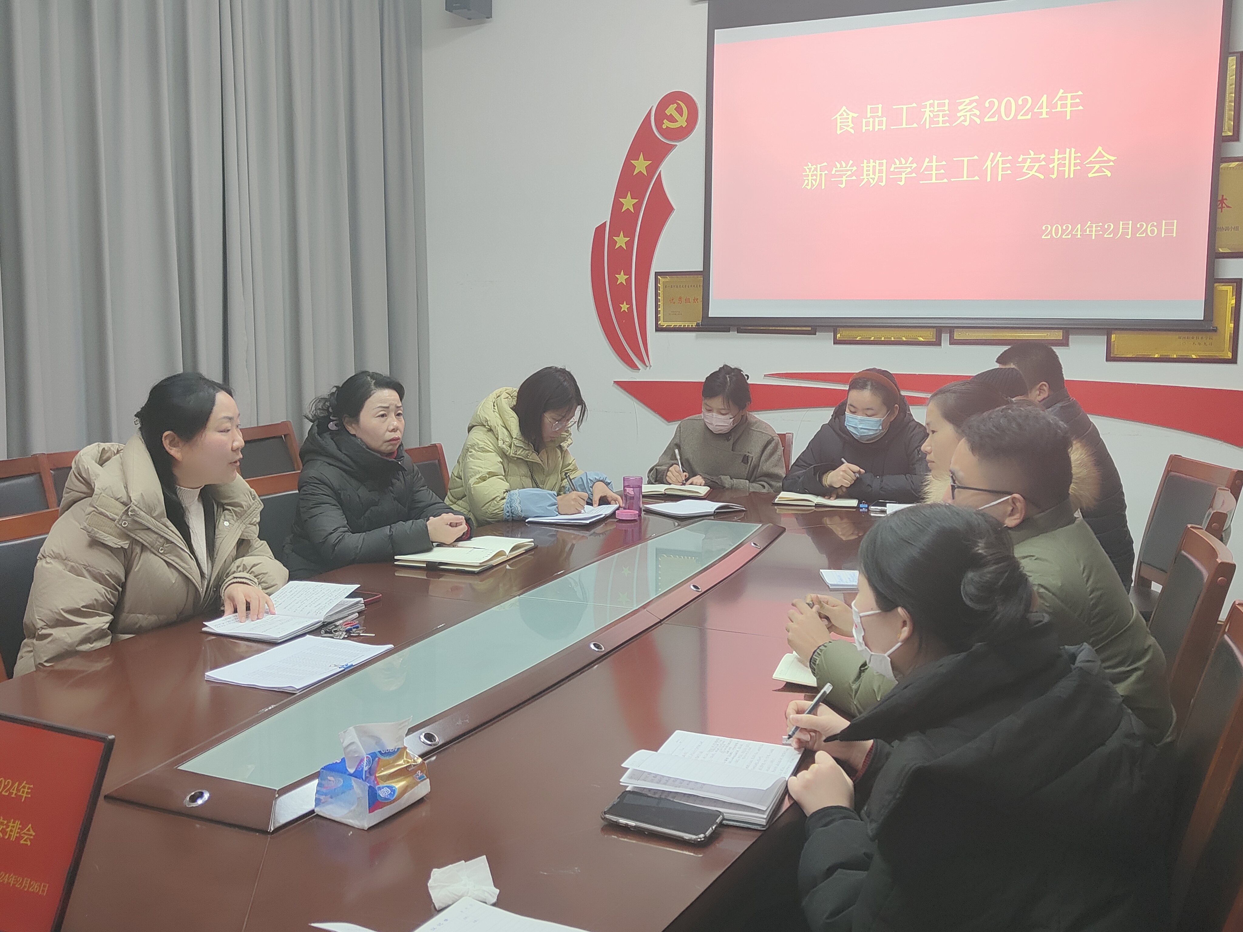 为及早谋划安排部署新学期各项工作,确保新学期各项工作开好头、起好步,2月26日下午,食品工程系召开了2024年新学期学生工作安排会。食品工程系党总支负责人王新娜、食品工程系学生管理负责人卢向飞、食品工程系团总支负责人侯鹏飞,以及全体辅导员参加了此次会议。