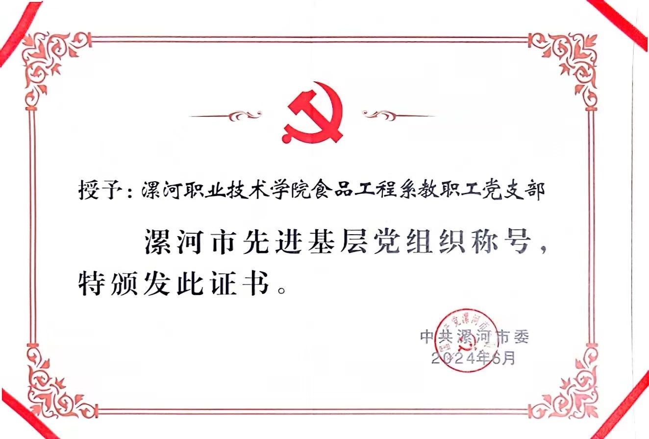 近日,在中共漯河市委举行的“七一”表彰活动中,食品工程系教职工党支部荣获“先进基层党组织”荣誉称号。食品工程系教职工党支部坚持党对教育事业的引领,牢固树立立德树人根本任务,在太阳集团tyc4633党委的领导和食品工程系党总支的指导下,强化党建引领,夯实队伍建设,建立战斗堡垒,深化职业教育改革,服务食品产业发展,切实做到“党建引领强业务,同心共建促发展”。