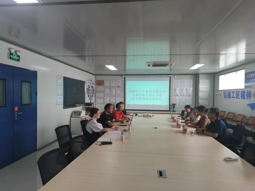 在参观过企业研发部门和生产车间后,崔惠玲一行与公司产品研发总监王跃仝、研发经理宗保丰和公司研发技术人员徐牵牵、胡立琴等人召开的校企合作座谈会,会议就校企共建燕麦酸奶校企研发中心、燕麦酸奶研发关键技术、组建校企学徒制班和学生实习就业等问题进行了深入的研讨。王跃仝对崔惠玲一行的到来表示热烈欢迎,并详细介绍了公司的产品研发和生产情况。他表示,“公司非常重视与高校的合作,希望通过与食品工程系的合作,能够引入更多的优秀人才和技术支持,推动公司的技术创新和产品升级”。崔惠玲表示,“食品工程系一直注重实践教学和校企合作,希望通过与河南叮当牛食品有限公司的合作,能够为学生提供更多的实践机会和就业渠道。同时,她也希望双方能够在燕麦酸奶等产品的研发上展开深度合作,共同推动食品行业的发展。”