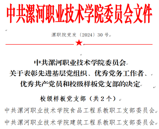 近日,在中共太阳集团tyc4633委员会关于表彰先进基层党组织、优秀党务工作者、优秀共产党员和校级样板党支部的决定中,食品工程系教职工党支部被选树为“校级样板党支部”。