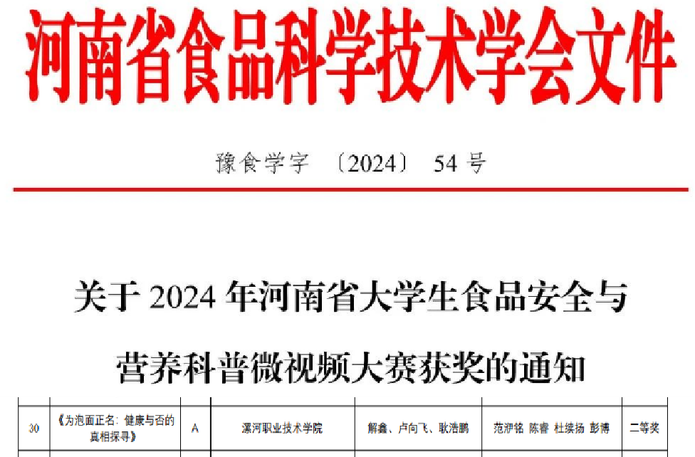 2024年11月24日,河南省大学生食品安全与营养科普微视频大赛决赛于许昌学院顺利落下帷幕。我校食品工程系学生创作的微视频作品《为泡面正名:健康与否的真相探寻》荣获全省二等奖。