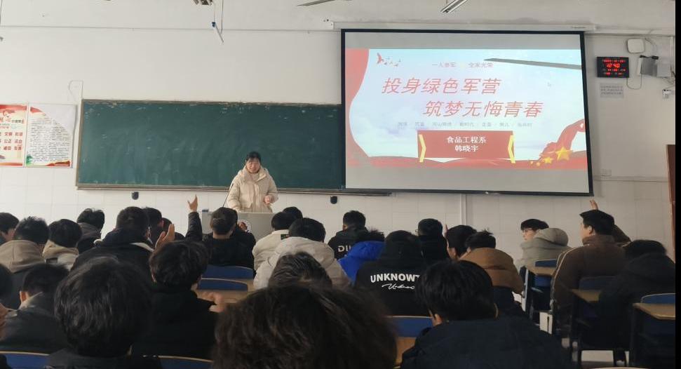 为进一步做好大学生参军入伍政策宣传工作,激发学生随笔从戎、参军报国的热情,2024年12月26日,食品工程系在3104教室举行征兵入伍宣讲会。