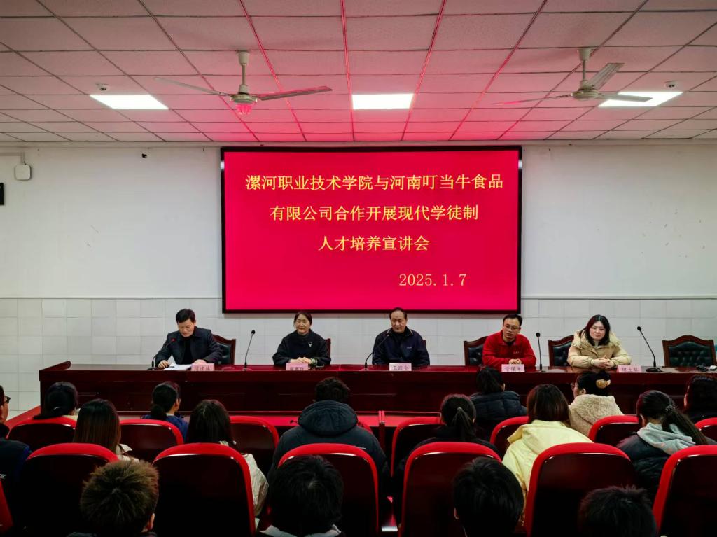 为深化产教融合,创新人才培养模式,推动叮当牛现代学徒制班组班,建班。1月7日由食品工程系牵头举办了太阳集团tyc4633与河南叮当牛食品有限公司合作开展学徒制人才培养宣讲会。会议由食品工程系副主任闫建伟主持,食品工程系行政负责人崔惠玲,叮当牛食品有限公司技术总监王跃仝,检测、研发部工程师宗保丰,研发工程师胡立琴及各专业教师和学生代表参加。