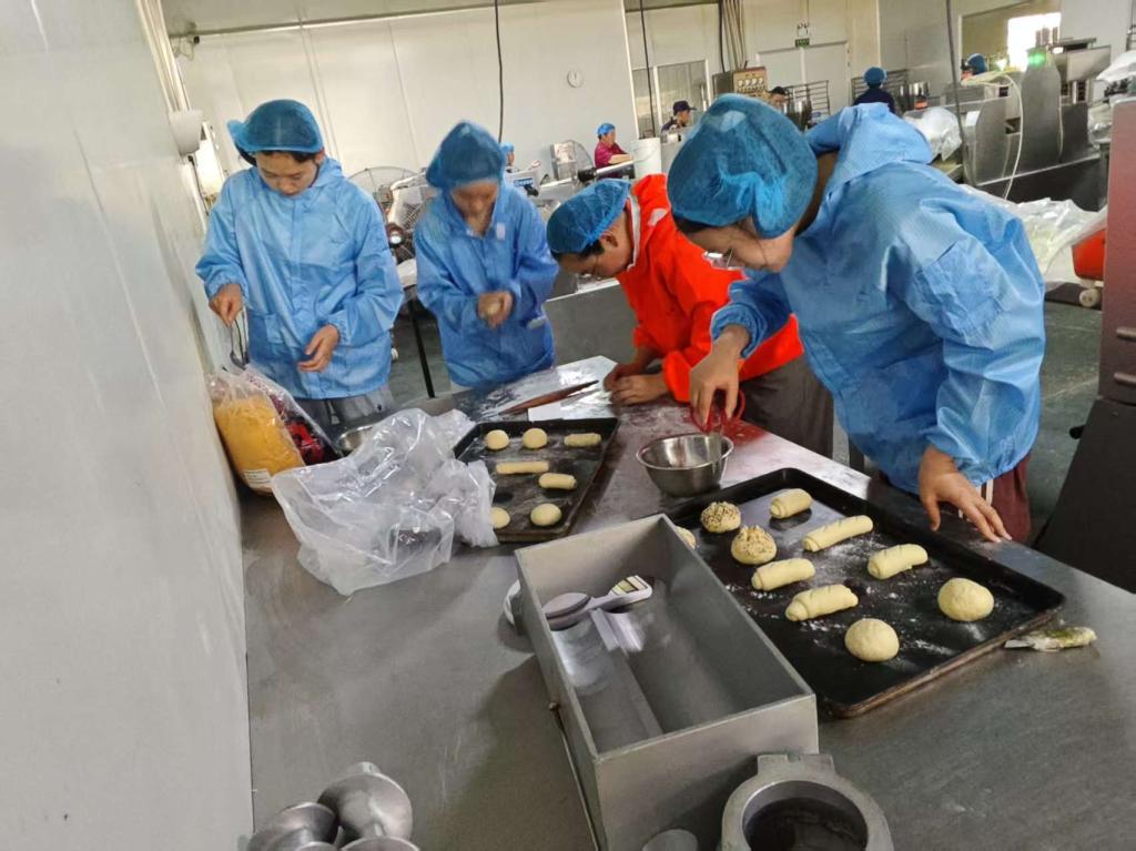 恒利源食品有限公司总经理李硕与崔惠玲一行就“米香风味面”的后续改良和成果转化进行了深入的研究和探讨,同时校企双方 又围绕产品特性分析、生产工艺参数改良、口感风味提升等关键核心问题进行了“米香风味面包”的规模化生产小试试验,试验取得很大成功。到场师生直接进入企业研发中心与企业师傅进行了现场交流,并学习了烘焙休闲食品生产线的生产流程,找出了自己产品与规模化生产产品之间的差距,团队师生均表示收益颇丰。