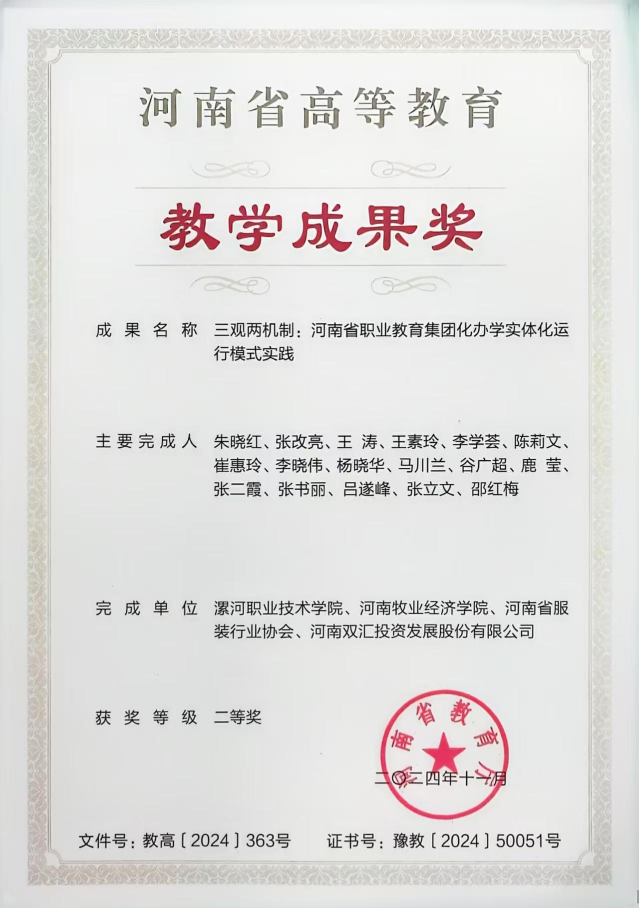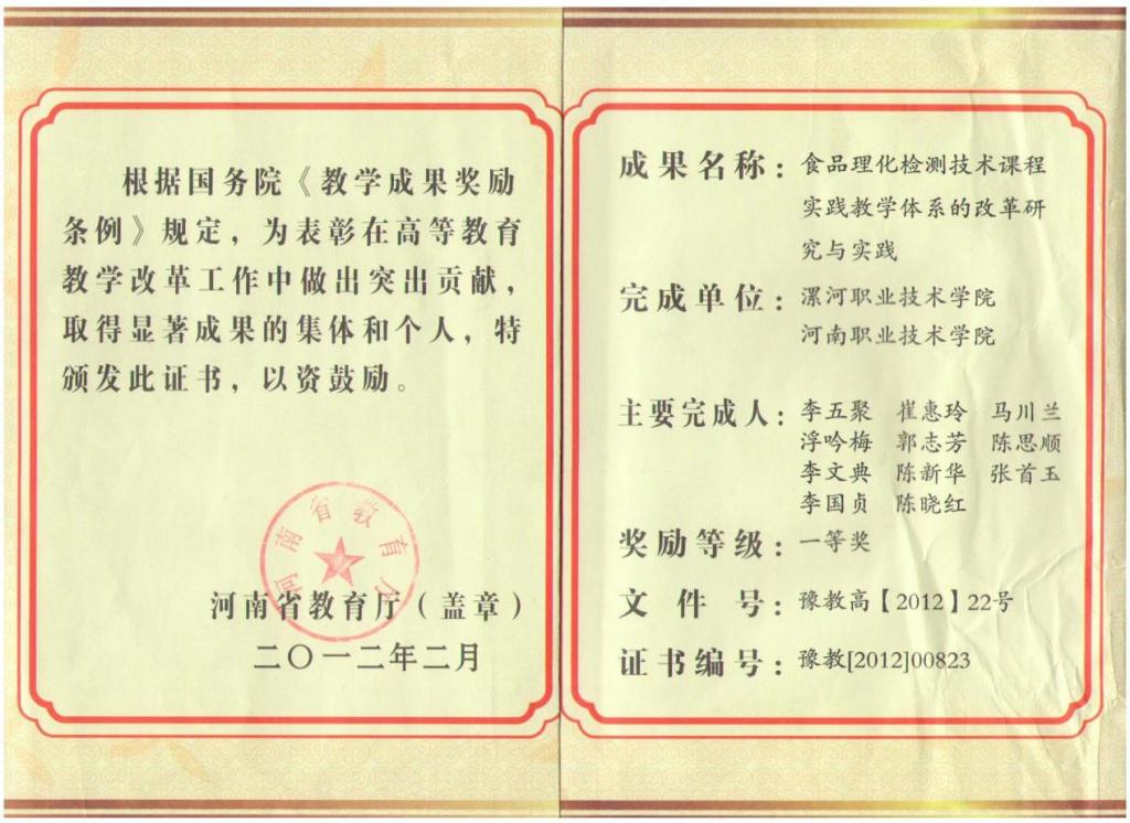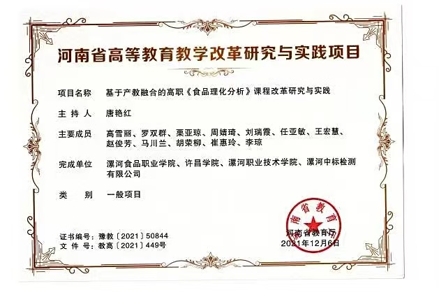 参编杨会会老师参加的河南省高等教育教学成果《基于“1+X”证书的食品类专业人才培养模式研究与实践》获得省级二等奖。